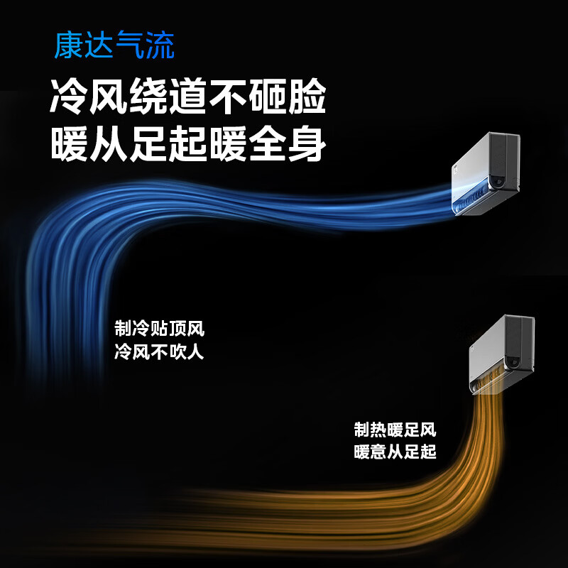 据介绍,美的空界 M5 空调采用巨浪引擎风道,支持 180° 立体环流风、9m 远距离送风;搭配 10 片贝形扩流百叶,支持 150° 左右自然风。该空调支持康达气流,制冷贴顶风,制暖暖足风。